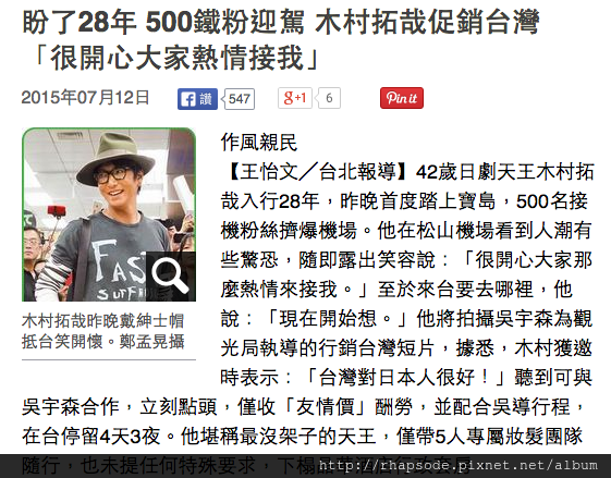 木村拓哉來台拍攝廣告,預計停留4天3夜,這是這兩天超夯的新聞,請見500鐵粉迎駕 木村拓哉促銷台灣 「很開心大家熱情接我」報導,對我來說,有種重溫以前木村超帥,大家都想模仿他髮型的那時候,就是美麗人生的造型啊,而看到新聞時,第一個感覺竟然很熟悉,而木村始終還是帥。